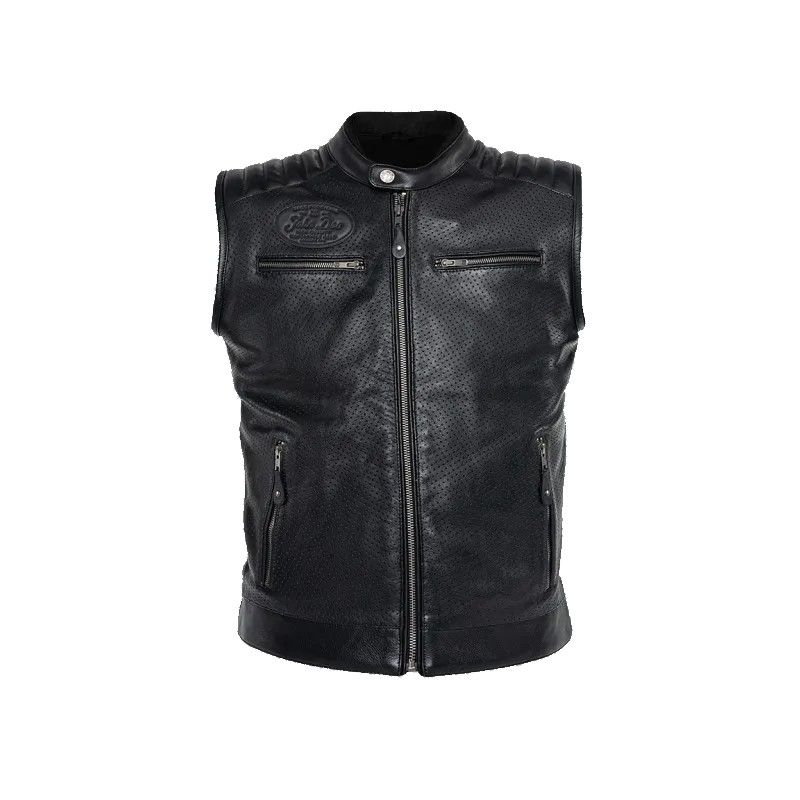 Storm Lädervästen erbjuder en autentisk design med genomtänkta detaljer, såsom perforerade ytor, vadderade axlar för en cool look, en ståkrage med tryckknapp, 2 rymliga innerfickor och 4 yttre fickor.